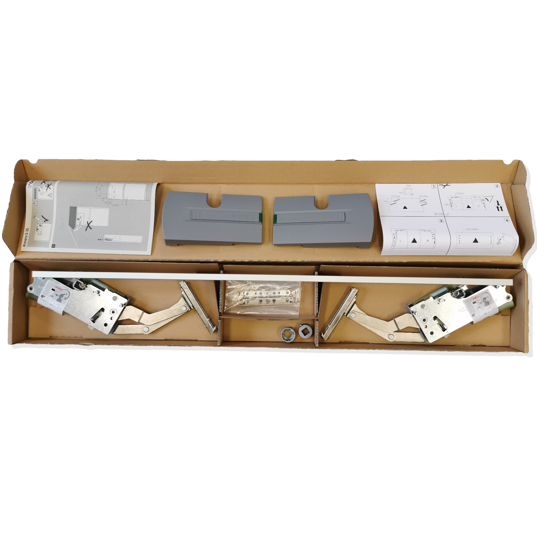 Kinvaro S-35 klaffbeslag med öppningsstöd och justerbar stängningsdämpning, med grå täcklock, från tillverkaren GRASS (Hetal). Komplett uppsättning