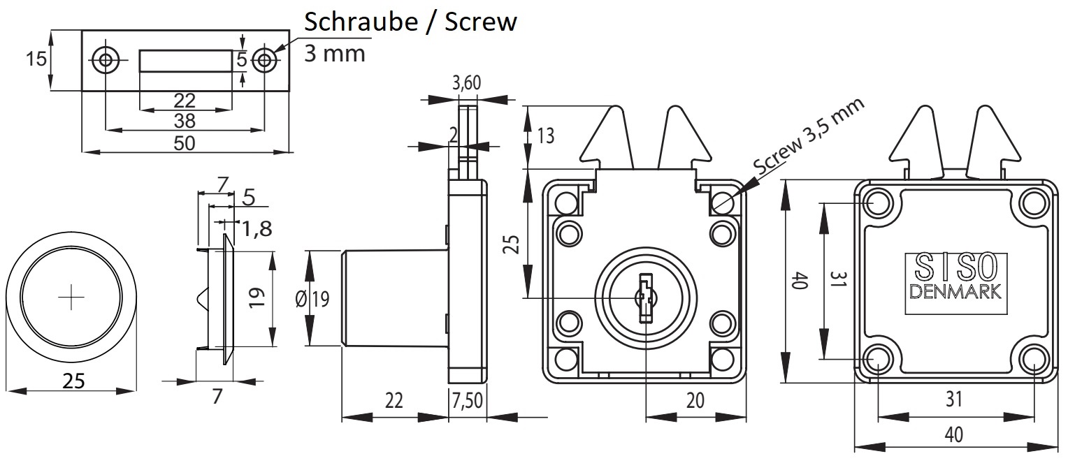 Högkvalitativt skruvbart rulljalusilås 14.01.450-1 från SISO, förnicklat, version: nycklad på olika sätt. Teknisk ritning